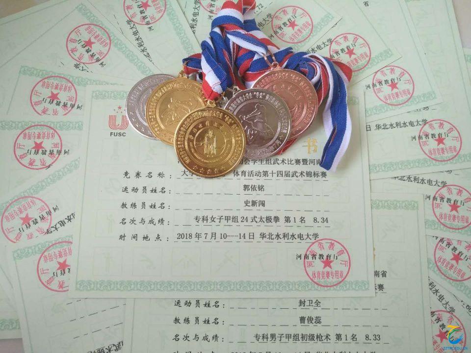 本次比赛吸引了省内60所高校,738名运动员同台竞技,交流学习。经过五天的激烈角逐,最终,在专科甲组女子比赛中,旅游外语系郭依铭分别荣获太极剑术第一名和太极拳术第二名,经济贸易系赵秋娟分别荣获初级棍术第一名和少林拳术第二名,酒店管理系张潇文分别荣获刀术第二名和初级长拳第三名,宋美琪荣获女子初级剑术第六名;在专科甲组男子比赛中,机电工程系封卫全分别荣获初级枪术第一名和少林拳术第五名,曾鹏分别荣获少林拳第六名和枪术第八名,李东阳荣获刀术第六名,烹饪食品系赵亚辉分别荣获太极拳第二名和棍术第三名,张万里荣获太极拳术第四名。艺术体育部史新闯和曹俊蕊老师荣获“优秀教练员”荣誉称号。