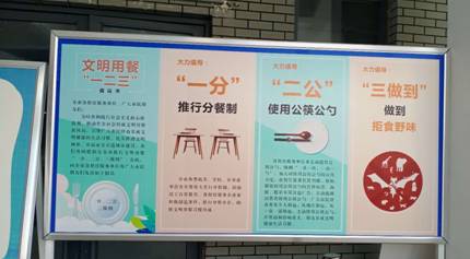 “一分”—推行分餐制。“二公”—使用公筷公勺,做到“一菜一筷、一汤一勺”。“三做到”—做到拒食野味、餐前洗手、“光盘行动”。