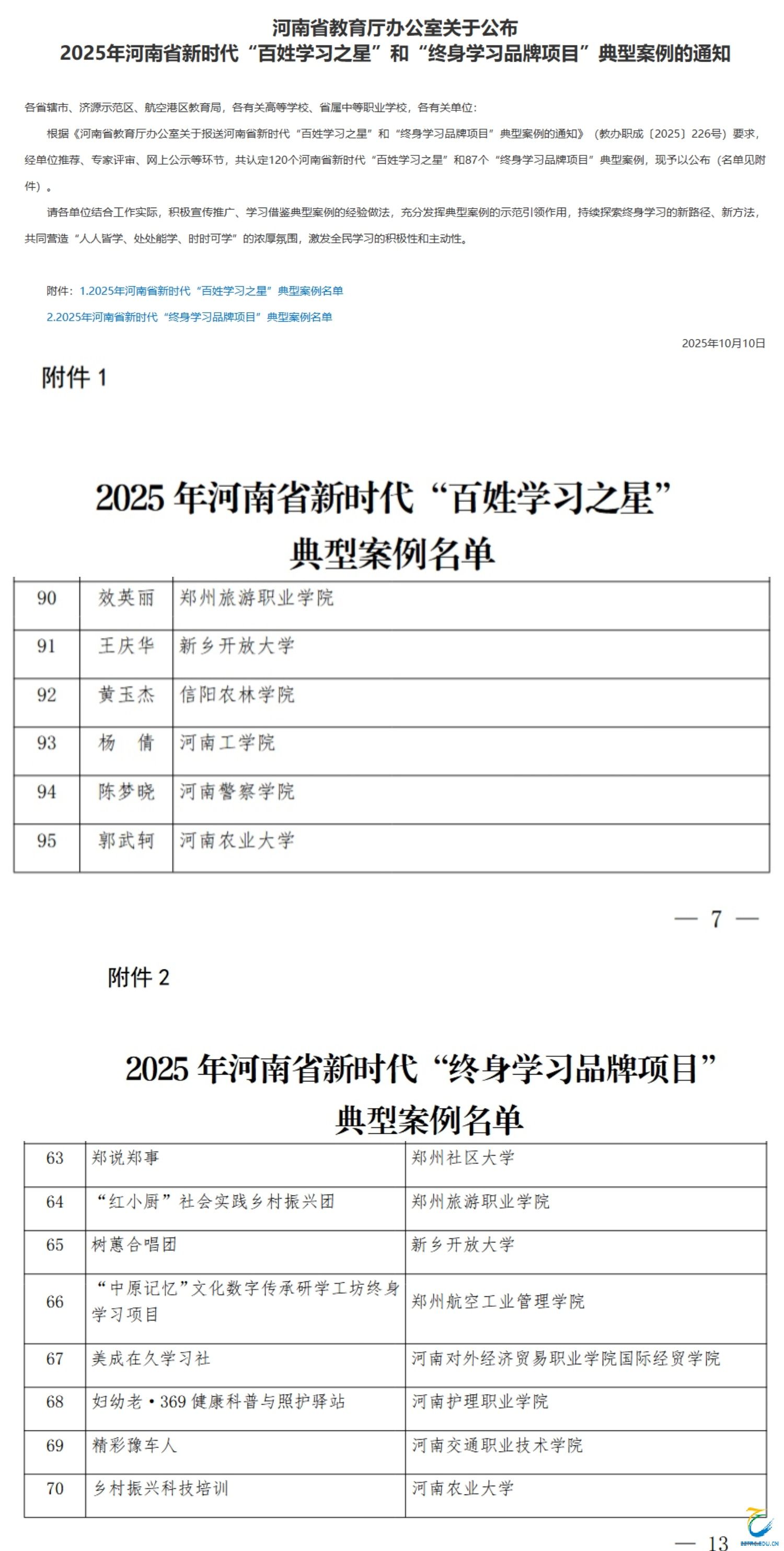近日,河南省教育厅公布2025年新时代“百姓学习之星”与“终身学习品牌项目”评选结果。由我校国际教育学院(继续教育学院)组织申报的两个项目均通过评选:我校退休教师效英丽荣获“百姓学习之星”称号,烹饪食品学院“‘红小厨’社会实践乡村振兴团”项目获评“终身学习品牌项目”。这两项省级荣誉的获得,实现了我校在全民终生学习项目上零的突破!